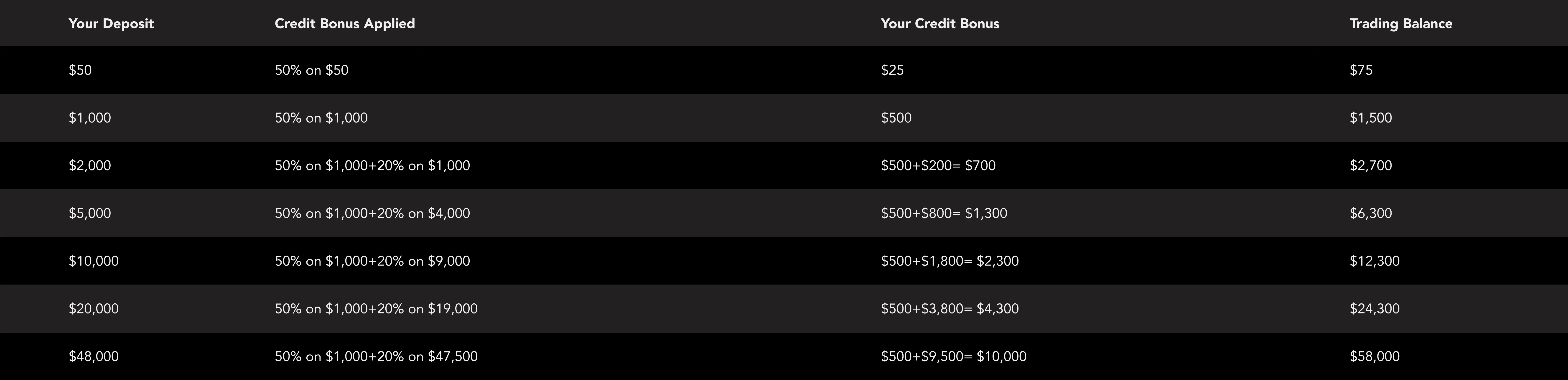 4.Eligible Clients (both new and existing clients), who meet the criteria set forth herein are able to receive credit bonuses or otherwise known as trading credit, equal to: