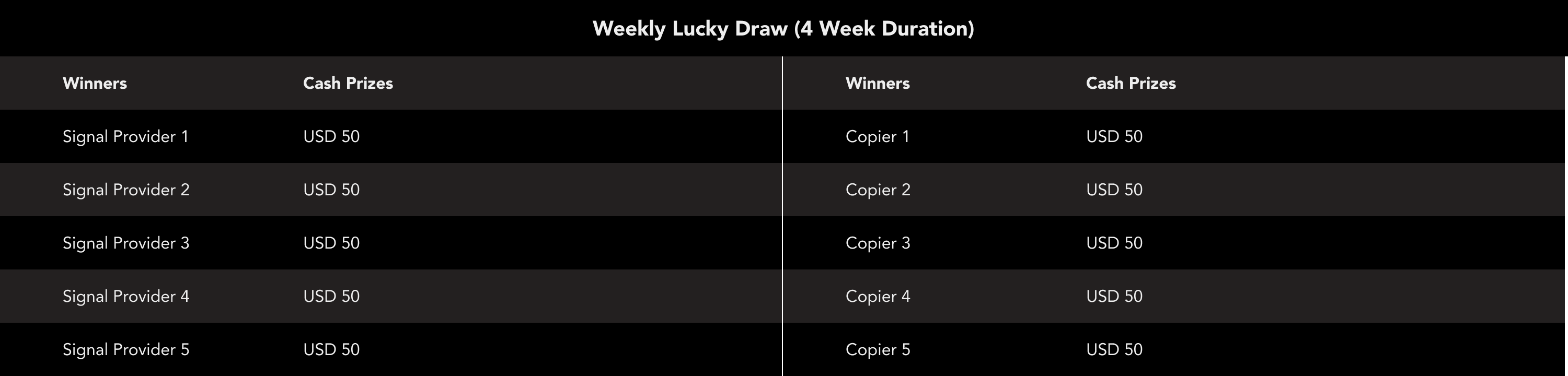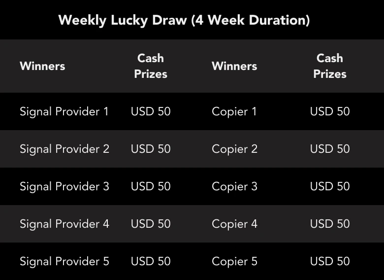 Five (5) Signal Providers and Five (5) Copiers will be randomly picked and awarded USD 50 Cash Prize each week.