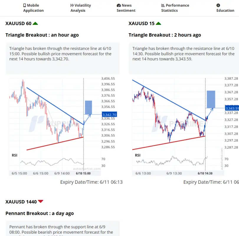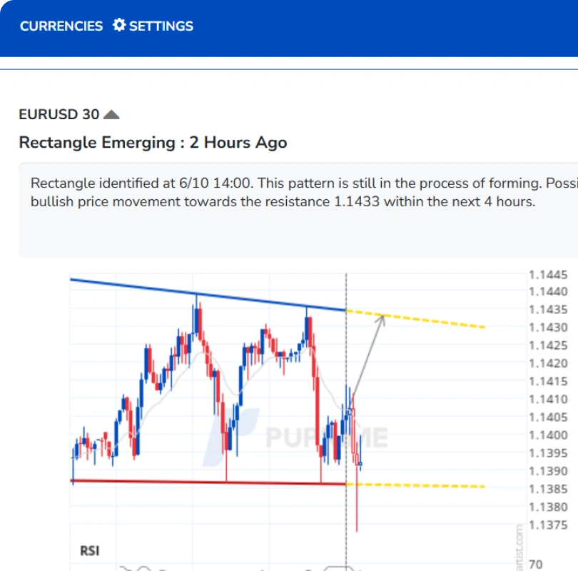 Verifică oportunitățile de tranzacționare la fiecare 15 minute pe baza tuturor tipurilor de analiză Autochartist.