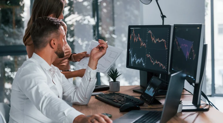 two colleagues doing financial research at the office