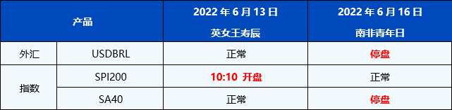 您好,受即将到来的英女王寿辰以及南非青年日假期影响,PU Prime的交易时间将有所调整。