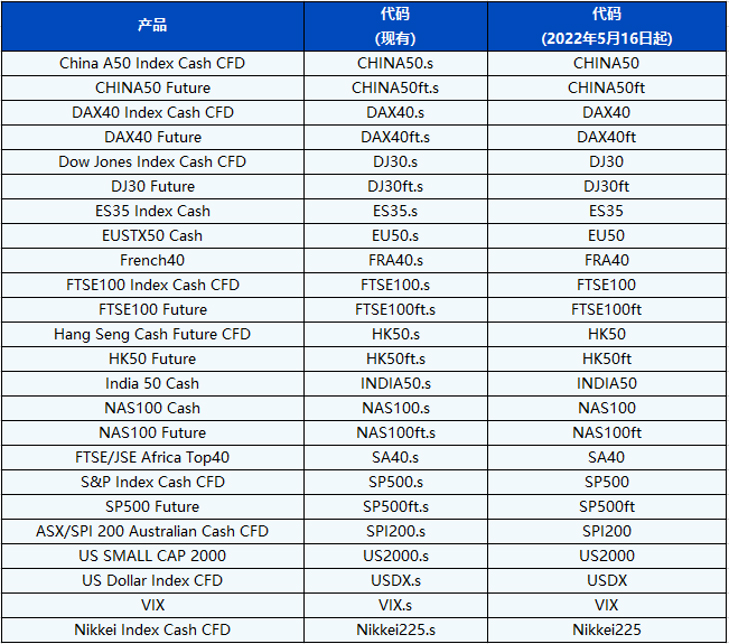 您好,为了让客户更容易地在交易平台上的“市场报价”中识别指数产品,从而加强客户的交易体验。由2022年5月16日起,PU Prime指数产品的代码将会移除后缀。