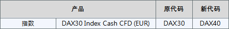 若您在代码变更的前一个交易日2021年12月10日持仓过夜,您持仓中的代码将在2021年12月13日替换为DAX40。这些变化只会影响到代码的重新命名,所有的产品规格将保持不变、同时也不会影响到您的持仓订单或自动关闭持仓订单。