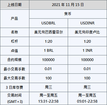 您好,为了更好满足广大客户对产品多元化的需求,PUPRIME 将在2021年11月15日上线新的外汇产品USDBRL 以及 USDINR。