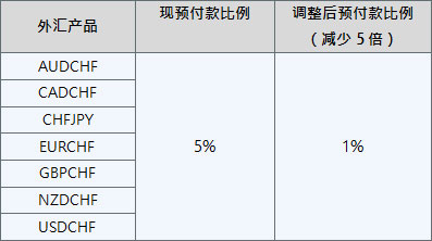 请留意,所有瑞士法郎(CHF)相关的外汇产品保证金较恢复前减少5倍,请审慎评估风险承受能力和合理管理仓位,并谨慎交易。