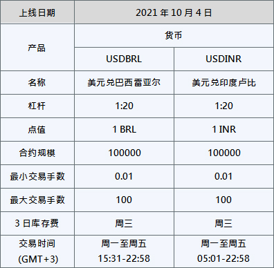 您好,为了更好满足广大客户对产品多元化的需求,PUPRIME 将在2021年10月4日上线新的外汇产品USDBRL 以及 USDINR。
