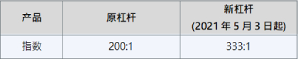 您好,为进一步提升PUPRIME的竞争力和优化客户的交易体验,从2021年5月3日起,所有指数产品的杠杆将从200:1调整为333:1