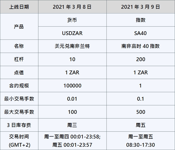 您好,为了更好满足广大客户对产品多元化的需求,PUPRIME 将在下列日期推出新产品,包括指数产品SA40和外汇产品USDZAR。
