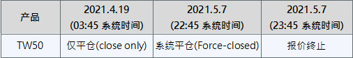 您好,应因流通性供应商的报价服务变更,PUPRIME将于2021年5月7日停止提供TW50指数合约产品报价,并于2021年4月19日设置为”Close Only”(仅平仓)状态。 而所有未平仓之TW50仓位将于5月7日关盘前1小时会被系统平仓。