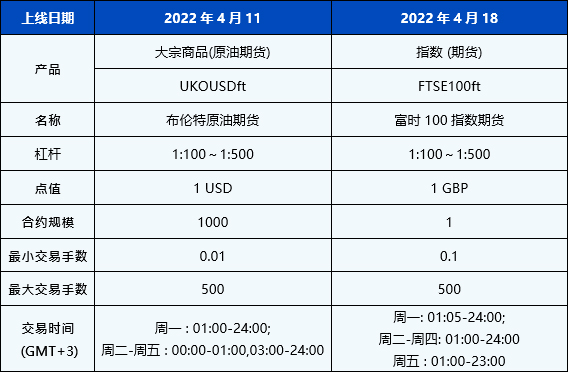 您好,为了更好满足广大客户对产品多元化的需求,我们将上线新的IFEU期货产品,布伦特原油期货(UKOUSDft)以及富时100指数期货(FTSE 100ft)。