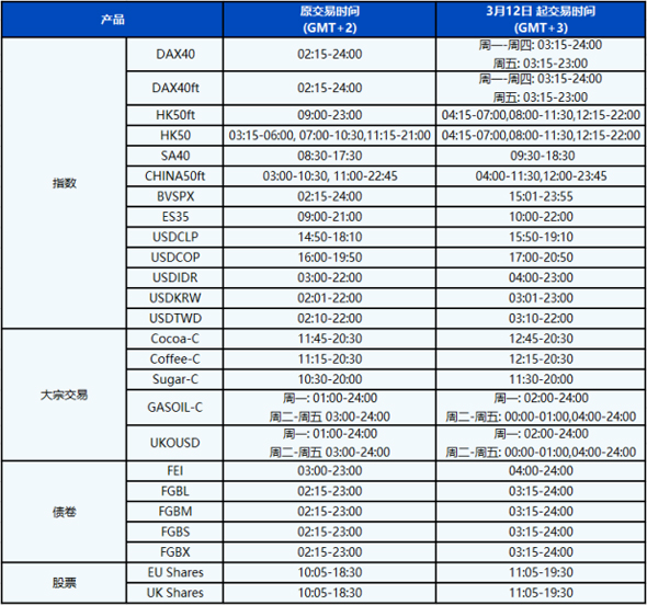 除MT4/MT5服务器时间将有所调整外,请参考下表了解涉及调整的产品情况: