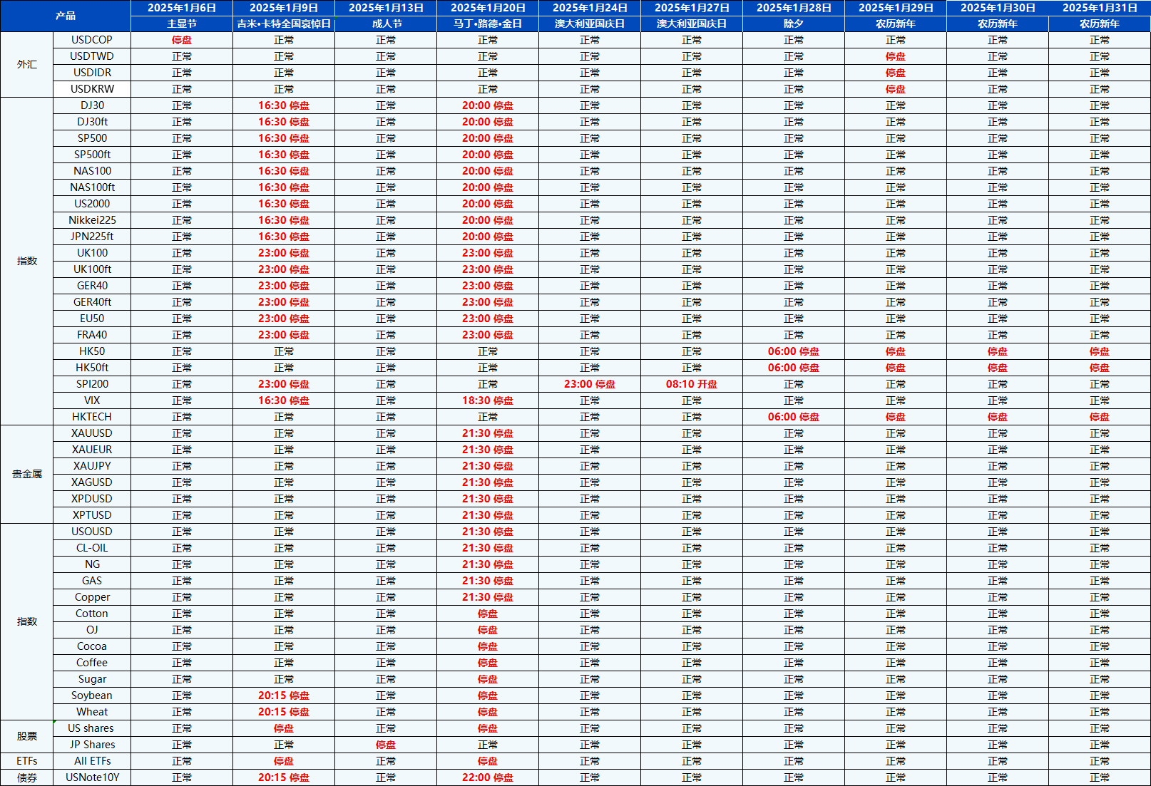 您好,受即将到来的1月份假期影响,PU Prime的交易时间将有所调整。
