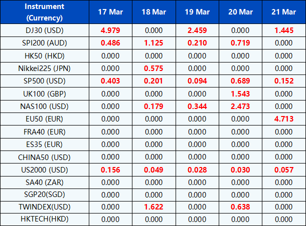 Please note the above data are subject to changes. Please refer to MT4/MT5 for details.