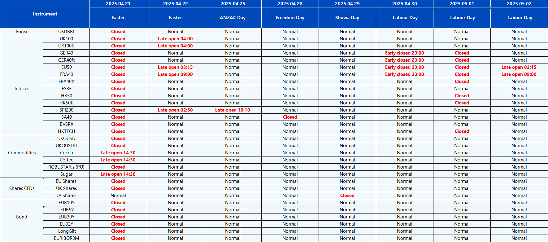 Please be advised that the following instruments’ trading hours and market session times will be affected by the upcoming April holidays and Labour Day.