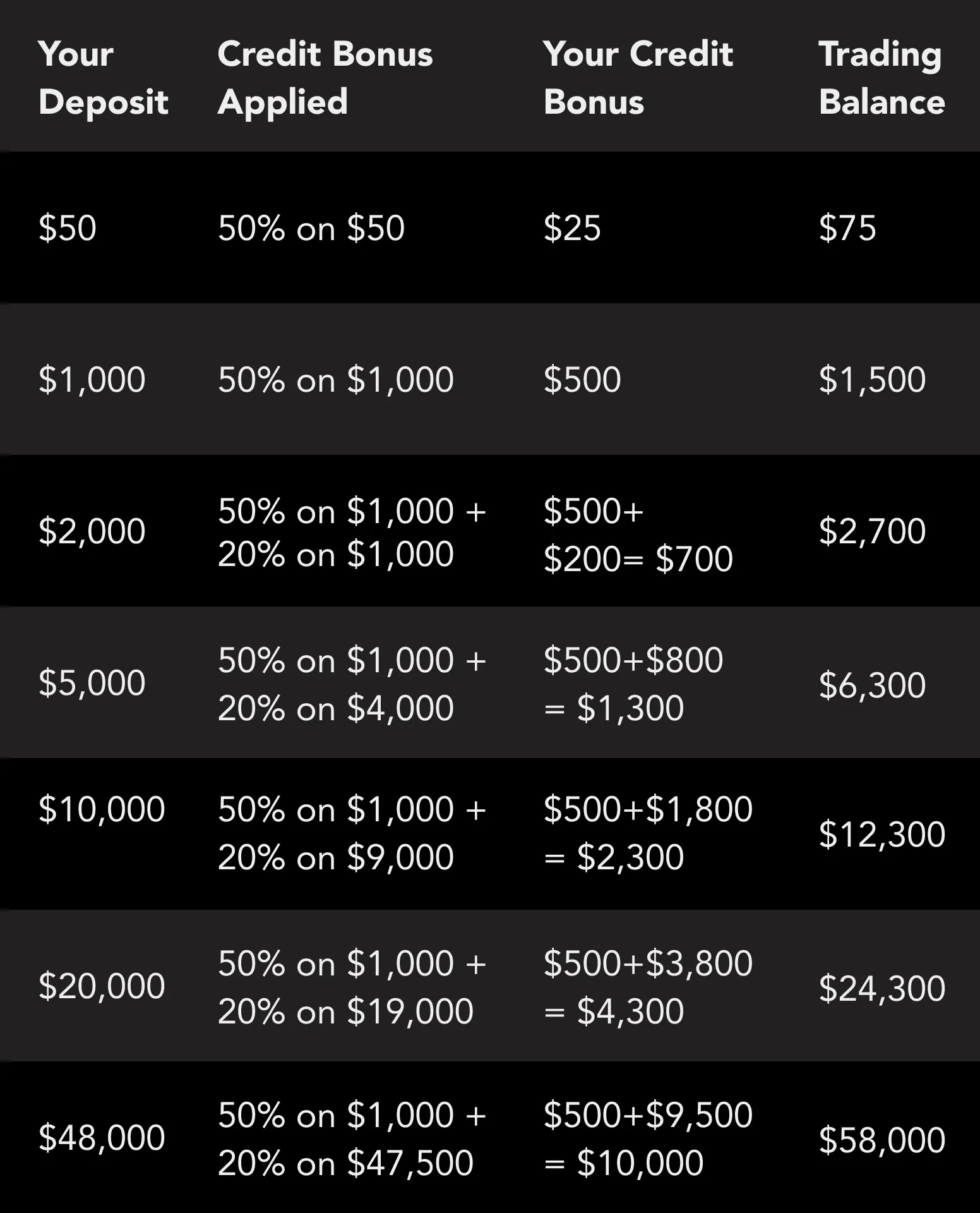 3. If there are multiple trading accounts under the same client’s name, all eligible trading accounts can participate in this promotion, and the system will count the deposit and withdrawal of the account that has received the credit bonus. Based on the client’s ID, clients with the same name account can only redeem a maximum of 10,000 USD in credit (or currency equivalent) in total. (Note: For this promotion, customers can only apply for the “50% Deposit Bonus” once, and all subsequent deposits are only calculated according to the 20% ratio)