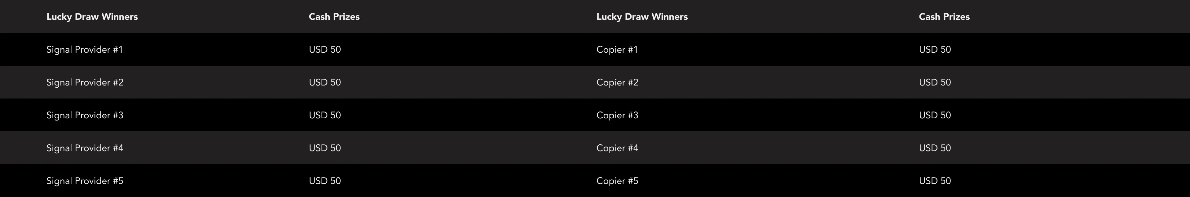 2.The “Copy Trading Lucky Draw” ("Promotion") may be offered by PU Prime from time to time to clients who open live trading accounts (excluding demo accounts) with PU Prime, in cases where such clients are referred to PU Prime via specific websites and/or social network sites in the context of certain specific promotions, and/or surveys that PU Prime may be running from time to time on such specific websites and/or social network sites.
