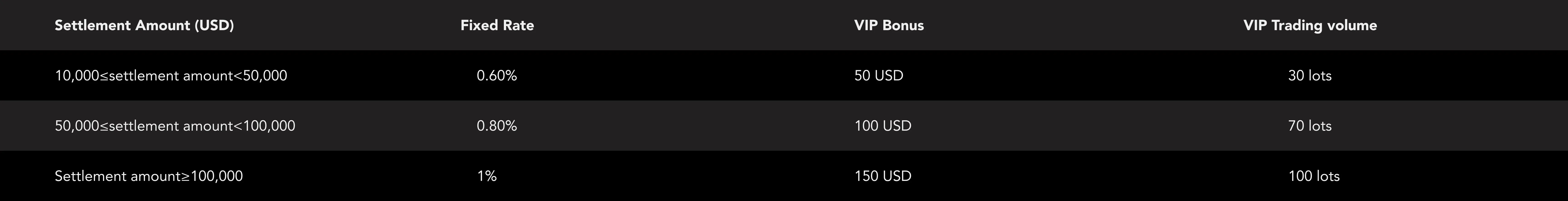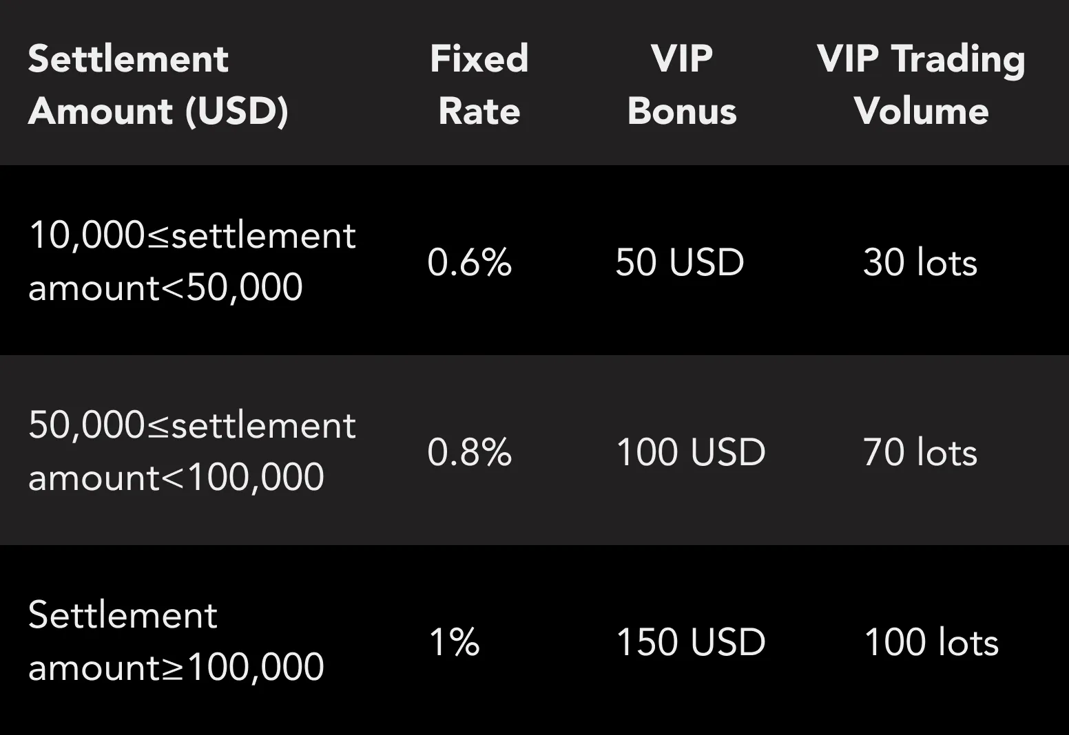 5.Eligible clients who meet the minimum settlement amount requirements can get the cashback next month. If clients also meet the requirements of trading volume, they can get the extra VIP bonus.